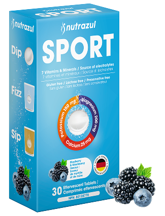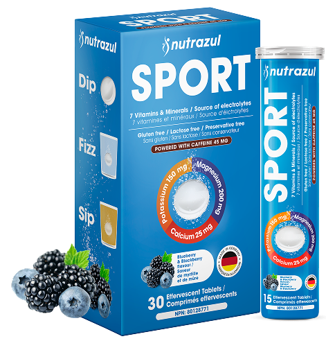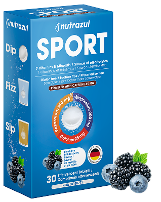 Comprimés effervescents Nutrazul Sport avec caféine | Électrolytes, énergie et soutien musculaire | 7 vitamines et minéraux pour l'hydratation et l'énergie, saveur myrtille et mûre, 30 comprimés